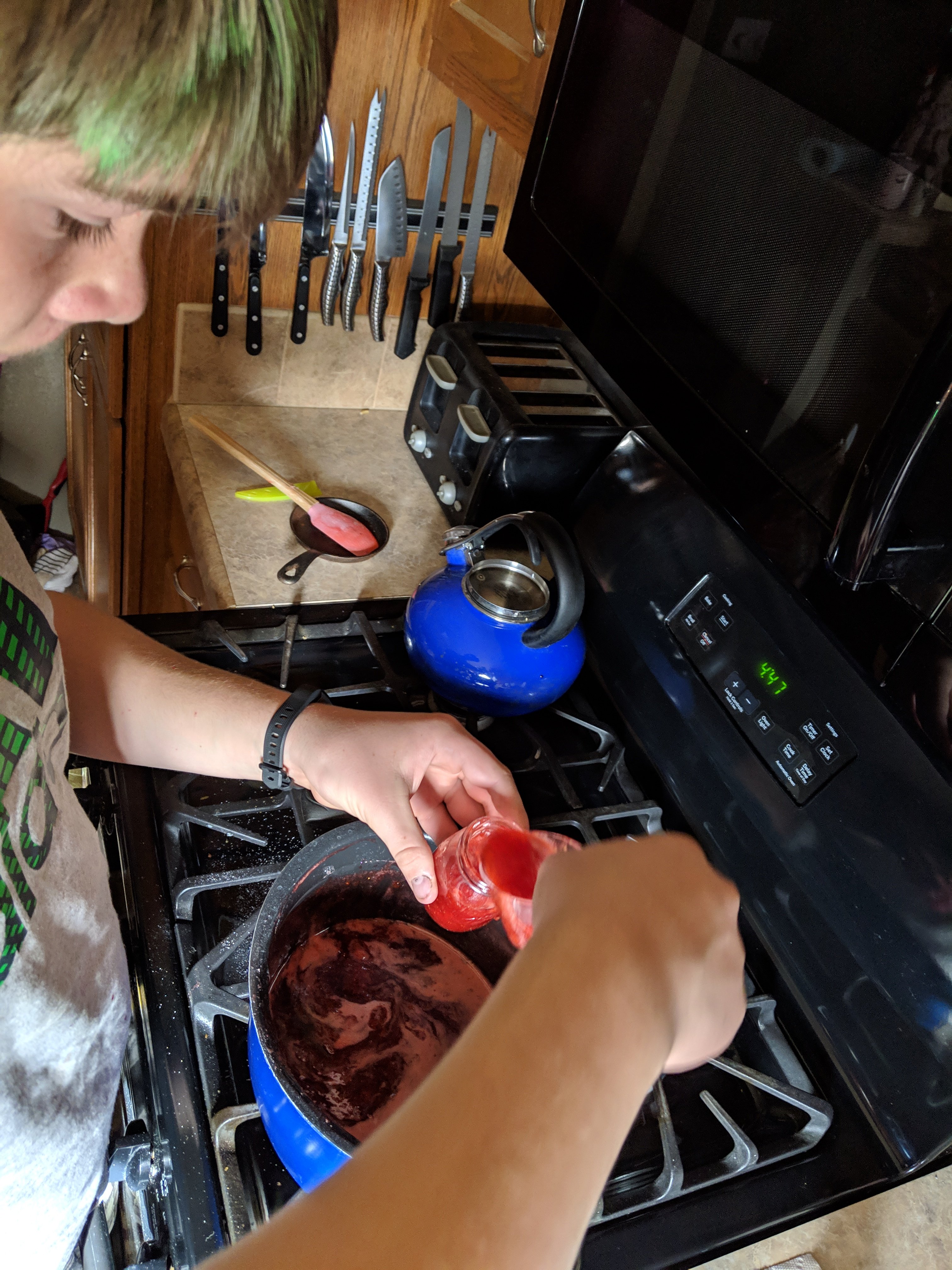 Fast forward 15 years and I am still bringing my kids into the kitchen with me. Today we decided to make strawberry freezer jam. YUM! Each kid took turns cutting (I love my little knife from Pampered Chef), measuring (my That’s a Bowl from Tupperware has been around forever) , stirring, cooking and pouring (again my Pampered Chef measuring cups).