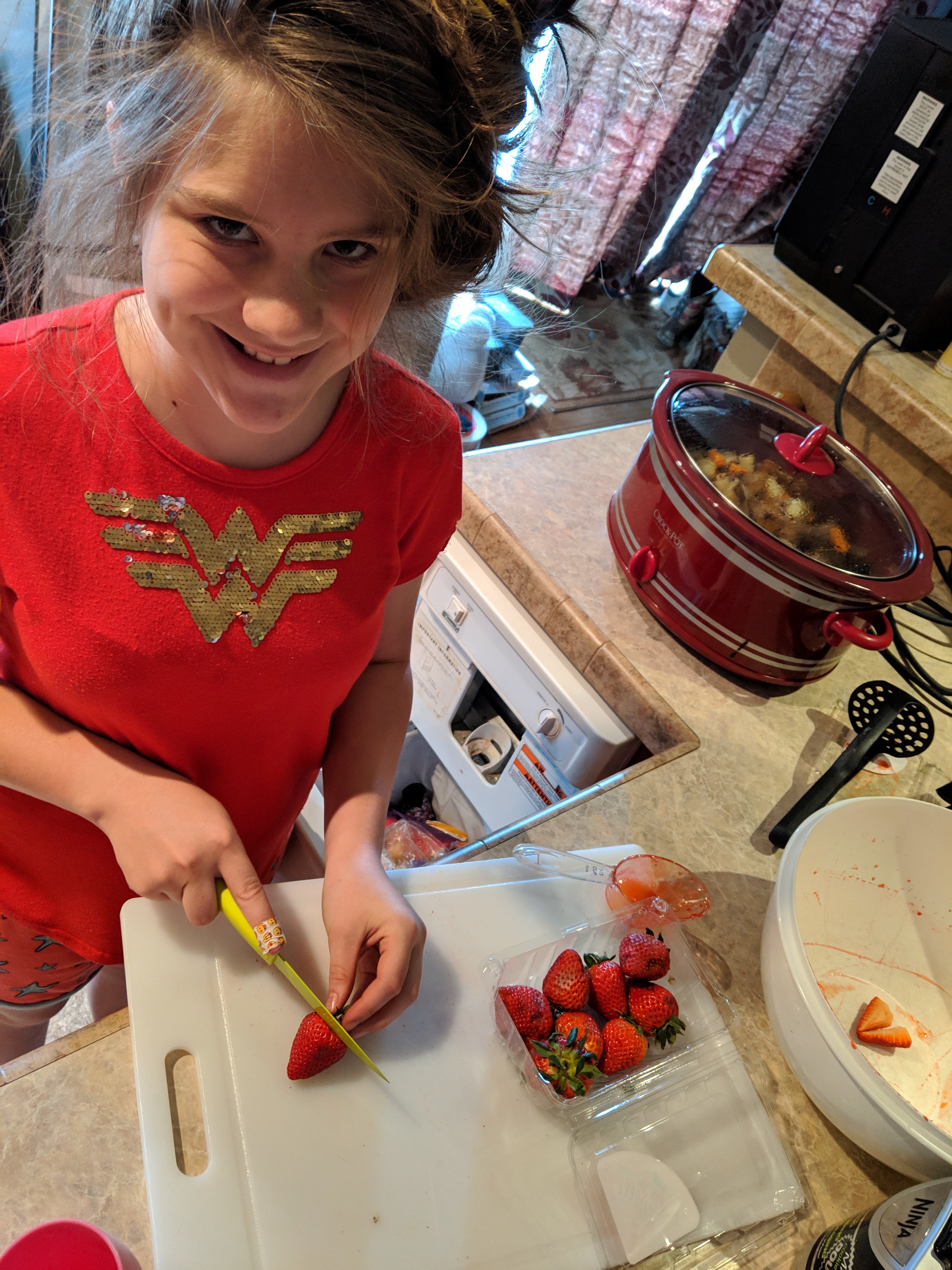 This recipe was quick and easy. It really didn’t take as long as I thought. And with a 12 and 15 year old supervision was minimal, except for the occasional, “He cut more strawberries than me”.