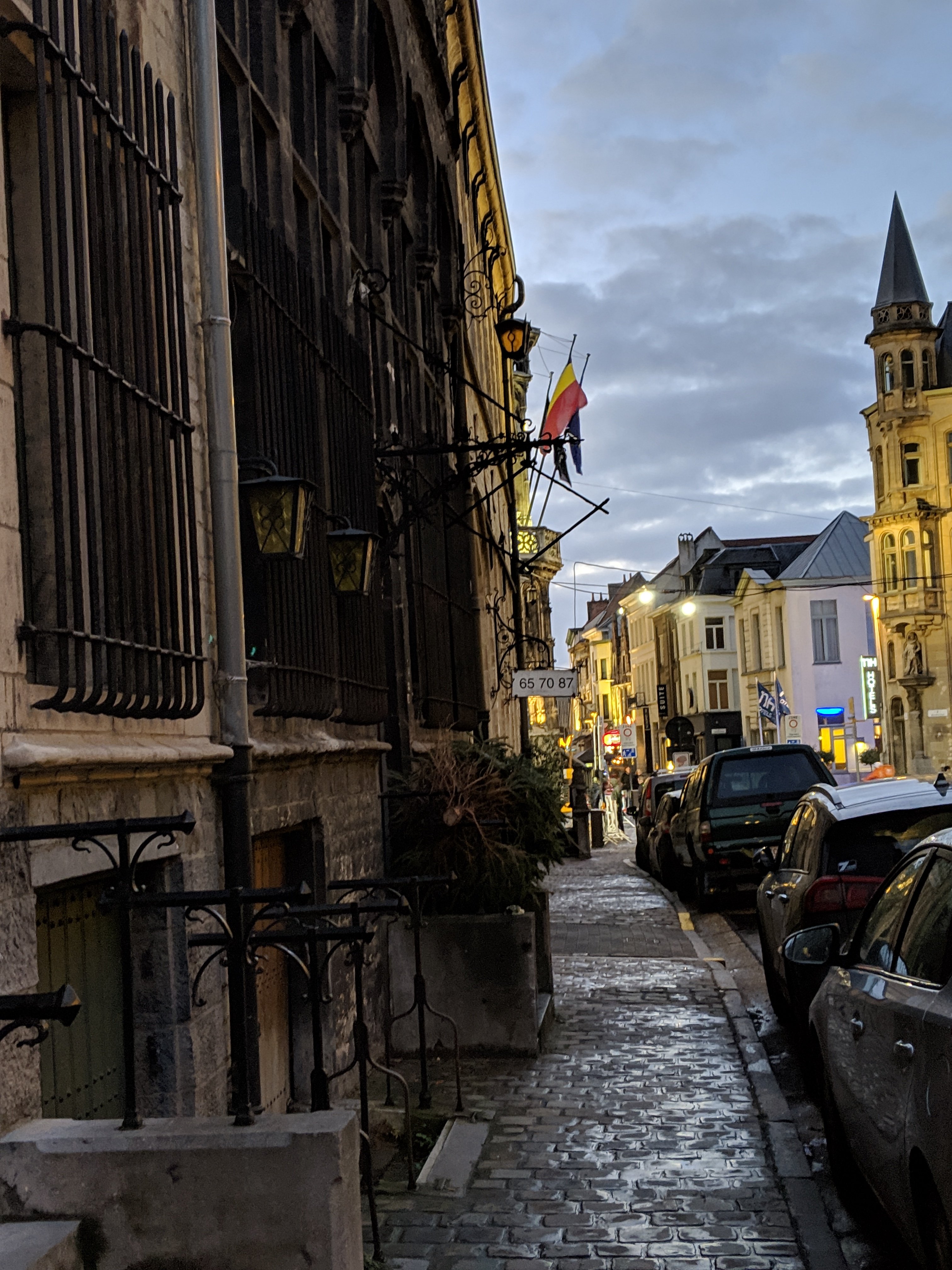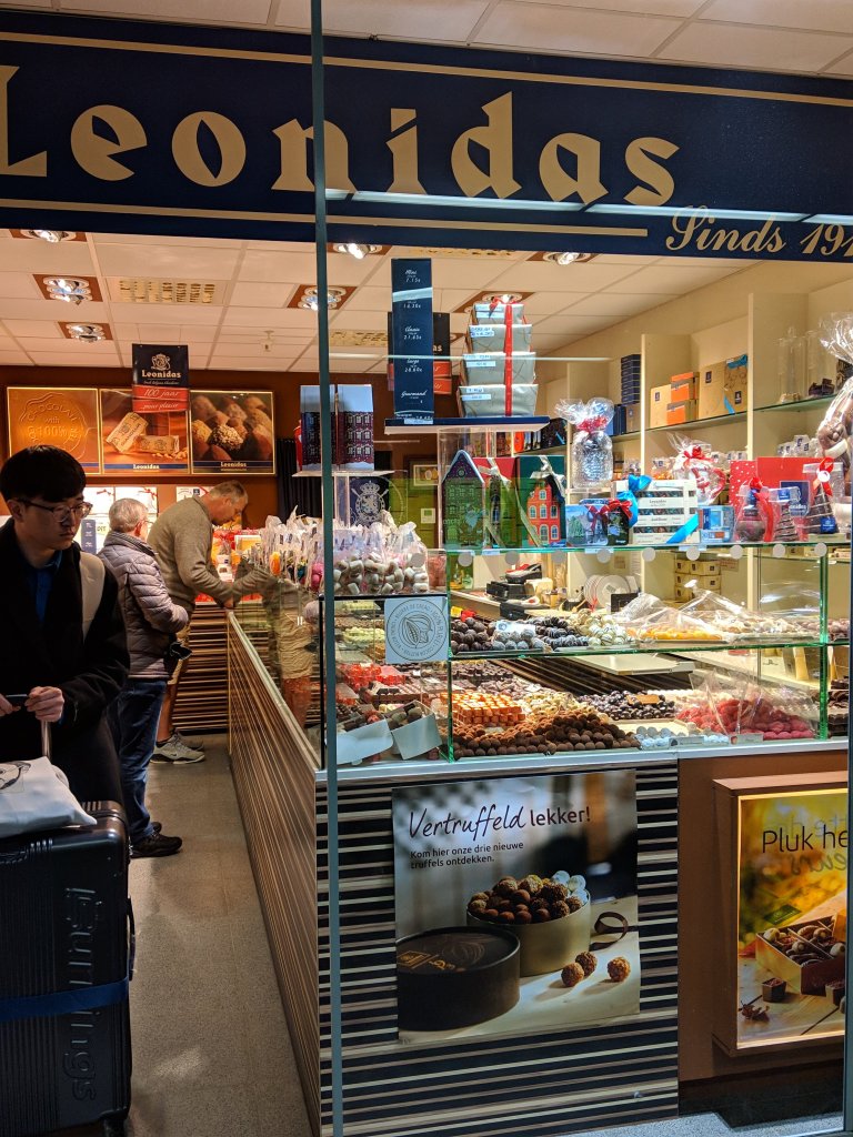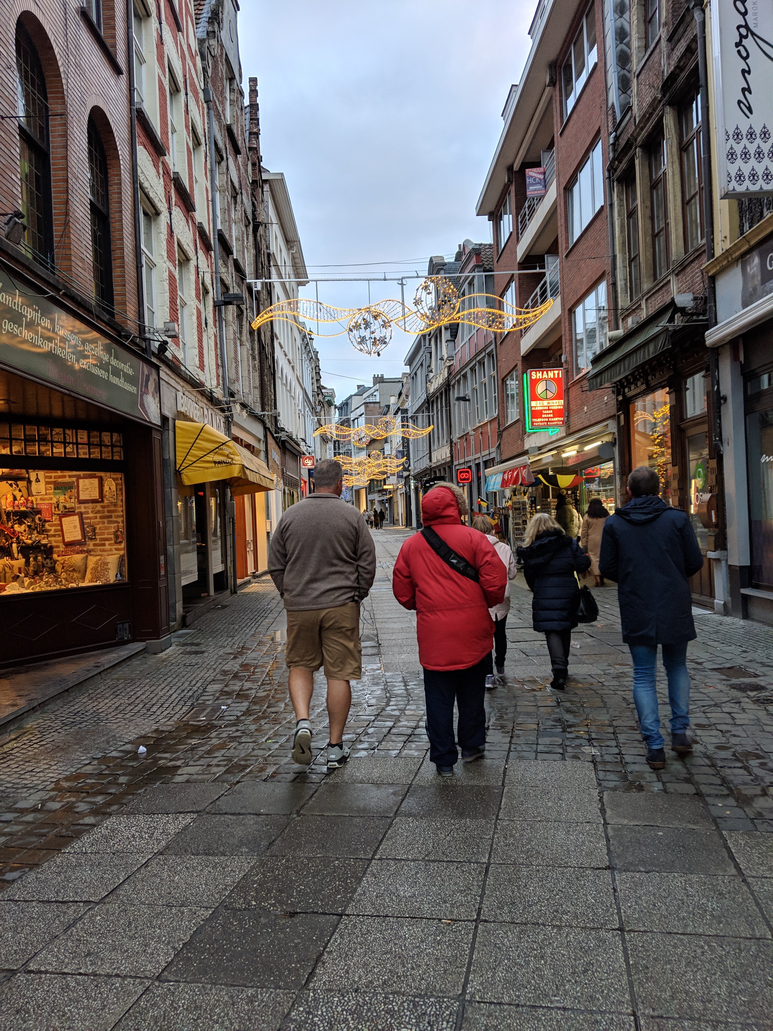When traveling in Belgium you will want to definitely layer your clothing. It was rainy while we were there, and a bit chilly. We didn’t mind as it was just such a cool place to visit. So many castles and market squares. Did I mention the chocolate. Oh my goodness. I can’t even describe how wonderful it is. I snapped a pic of hubby at his favorite chocolate spot. Leoneda’s.